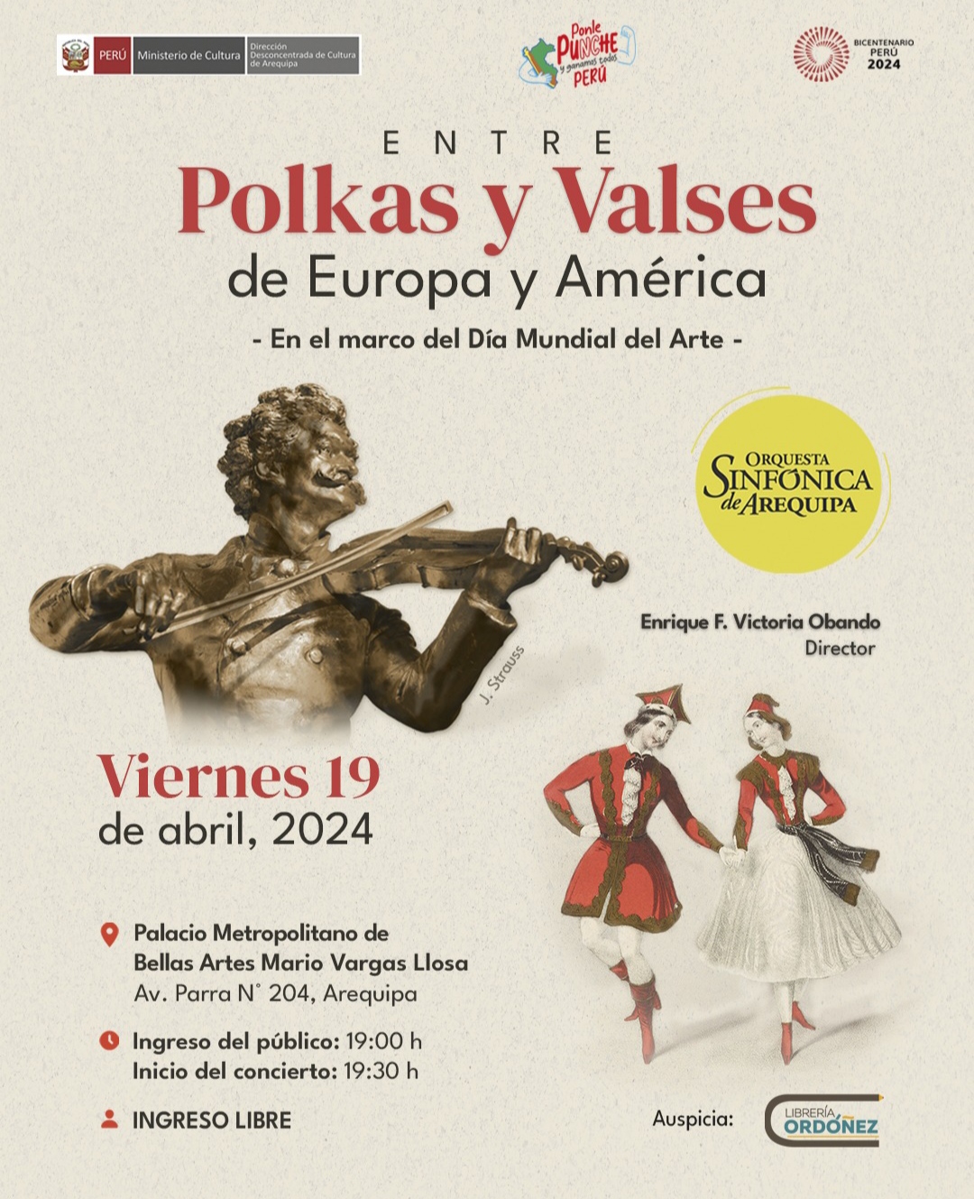 La Orquesta Sinfónica de Arequipa, elenco artístico del Ministerio de Cultura – Arequipa, presentará el evento denominado “Entre Polkas y Valses de Europa y América”, bajo la dirección de su director titular, Maestro Enrique F. Victoria Obando.