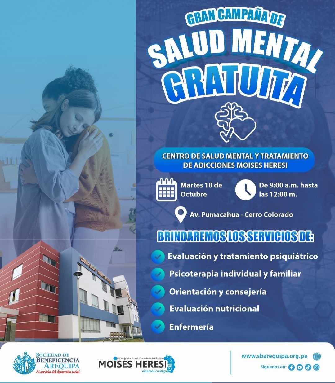 La Sociedad de Beneficencia de Arequipa, a través del Centro de Salud Mental Moisés Heresi, llevará a cabo este próximo martes 10 de octubre una gran campaña gratuita por el día de la Salud Mental.