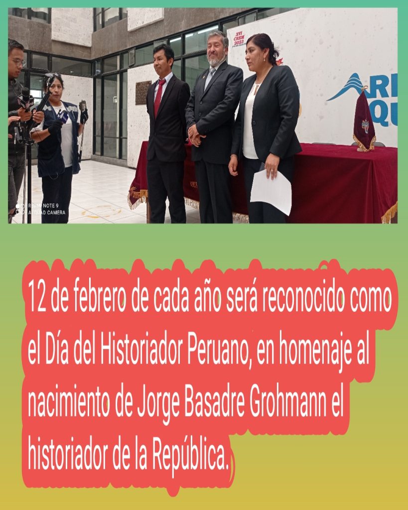 Según esta ley, el 12 de febrero de cada año será reconocido como el Día del Historiador Peruano, en homenaje al nacimiento de Jorge Basadre Grohmann el historiador de la República.