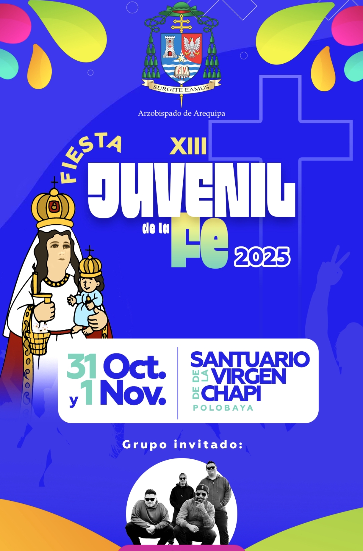 La XIII Fiesta Juvenil de la Fe reunirá a miles de jóvenes en el Santuario de la Virgen de Chapi los días 31 de octubre y 1 de noviembre con un festival musical que incluye la participación del grupo colombiano «Estación Cero» y el Ministerio de Música de la Arquidiócesis de Arequipa.