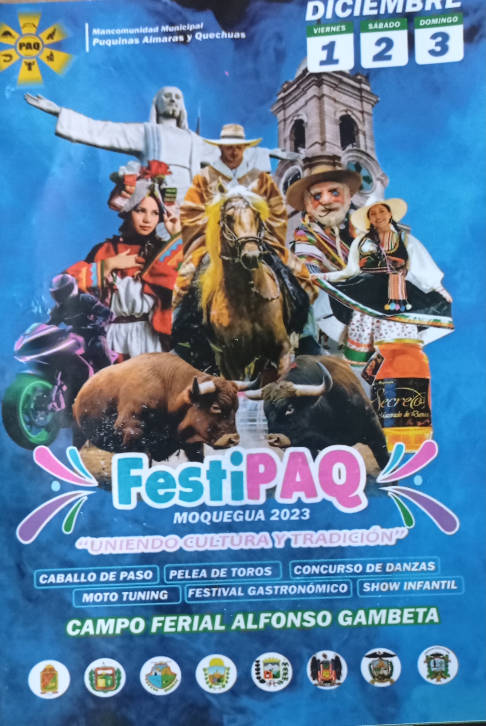 Impulsando lo mejor de la producción agropecuaria, agroindustrial, gastronómica y artesanal de la Mancomunidad de los Puquinas, Aymaras y Quechuas, conformada por las municipalidades distritales de Torata, Puquina, San Cristobal Calacoa, Chojata, La Capilla, Lloque, Quinistaquillas y Yunga, liderada por el presidente de la misma, Ing. Elvis Córdova Nina, se organiza el tan esperado I FESTIPAQ Moquegua 2023, del 01 al 03 de diciembre en el Campo Ferial Alfonso Gambeta.